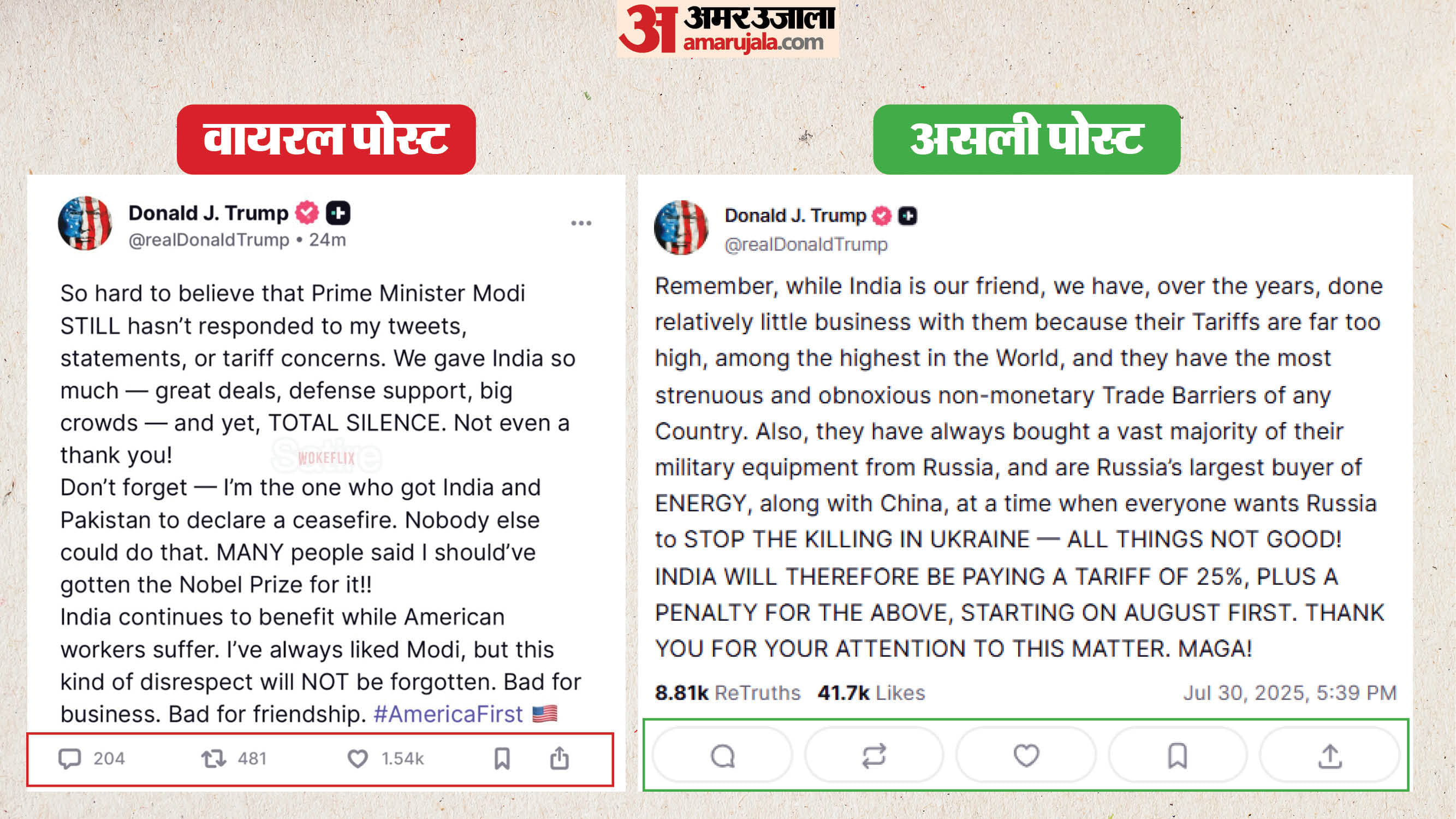 सोशल मीडिया पर डोनाल्ड ट्रंप के नाम से एक पोस्ट शेयर कर दावा किया जा रहा है कि डोनाल्ड ट्रंप ने ट्रूथ सोशल पर लिखा है कि भारत के प्रधानमंत्री नरेंद्र मोदी ने अभी तक मेरे ट्वीट्स का जवाब नहीं दिया है। इसके साथ ही पोस्ट में लिखा है कि यकीन करना मुश्किल है कि प्रधानमंत्री मोदी ने अभी तक मेरे ट्वीट्स, बयानों या टैरिफ संबंधी चिंताओं का जवाब नहीं दिया है। हमने भारत को इतने शानदार सौदे दिए, रक्षा सहयोग दिया, बड़ी भीड़ जुटाई, फिर भी, पूरी तरह से खामोशी। एक शुक्रिया तक नहीं! मत भूलिए - मैं ही वो व्यक्ति हूं, जिसने भारत और पाकिस्तान के बीच युद्धविराम की घोषणा करवाई। कोई और ऐसा नहीं कर सकता था। कई लोगों ने कहा कि मुझे इसके लिए नोबेल पुरस्कार मिलना चाहिए था!! भारत को फायदा हो रहा है जबकि अमेरिकी मजदूरों को नुकसान हो रहा है। मुझे मोदी हमेशा से पसंद रहे हैं, लेकिन इस तरह का अनादर कभी नहीं भुलाया जाएगा। व्यापार के लिए बुरा। दोस्ती के लिए बुरा।