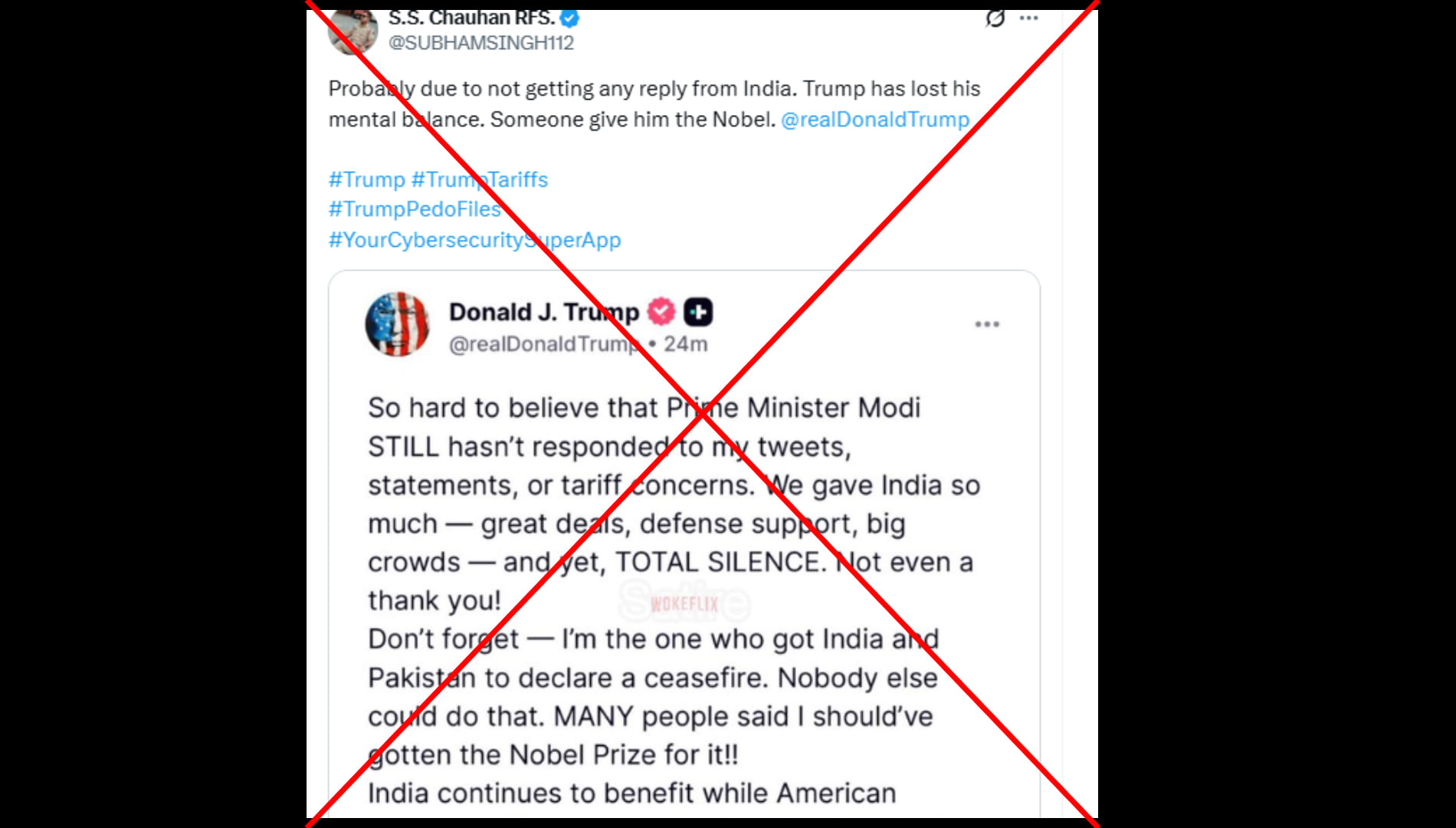 एसएस चौहान आरएफएस (@SUBHAMSINGH112) नाम के एक्स यूजर ने पोस्ट शेयर कर लिखा “शायद भारत से कोई जवाब न मिलने की वजह से, ट्रंप अपना मानसिक संतुलन खो बैठे हैं। कोई उन्हें नोबेल दे दो।” पोस्ट का लिंक आप यहां और आर्काइव लिंक यहां देख सकते हैं।