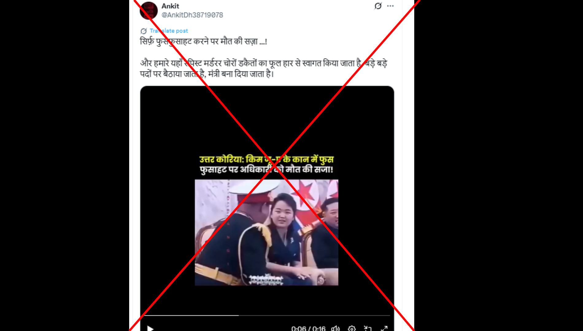 अंकित (@AnkitDh38719078) नाम के एक्स यूजर ने लिखा, “सिर्फ फुसफुसाहट करने पर मौत की सजा ...! और हमारे यहां रेपिस्ट मर्डरर चोरों डकैतों का फूल हार से स्वागत किया जाता है, बड़े बड़े पदों पर बैठाया जाता है, मंत्री बना दिया जाता है।” पोस्ट का लिंक आप यहां और आर्काइव लिंक यहां देख सकते हैं।