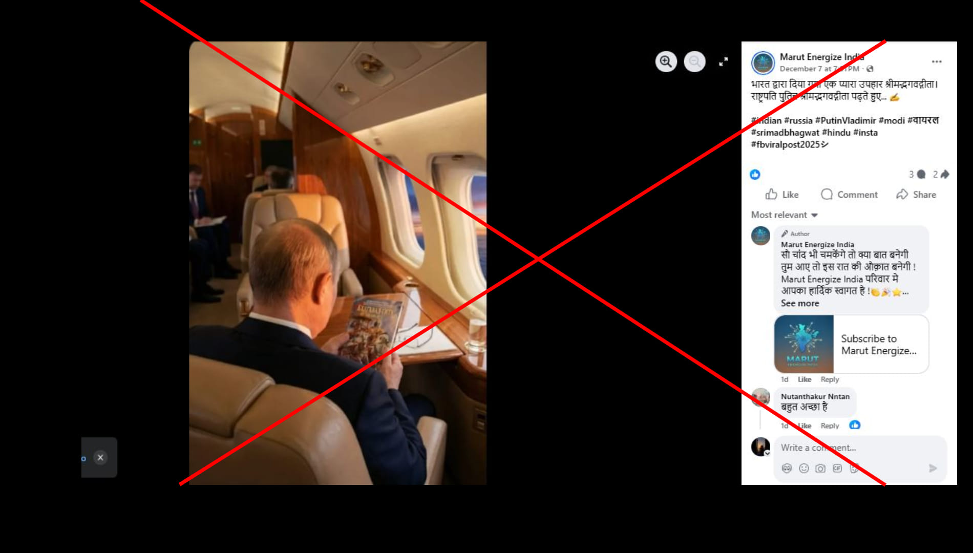 सोशल मीडिया पर एक तस्वीर शेयर कर दावा किया जा रहा है कि पुतिन अपने विमान में भारत की ओर से दी गई भगवत गीता पढ़ रहे हैं।