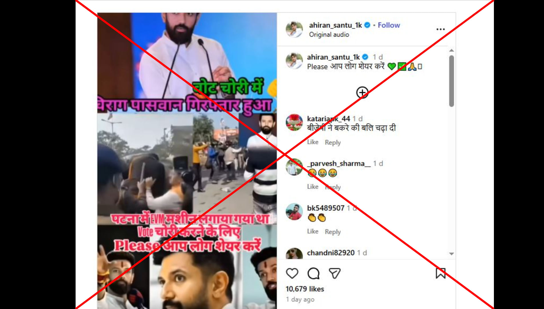 Ahiran_santu_1k' नाम के इंस्टाग्राम यूजर ने लिखा “ कृपया इसको शेयर करे। इसके साथ ही वीडियो में लिखा है कि वोट चोरी में चिराग पासवान गिरफ्तार हुआ। पटना में ईवीएम मशीन लगाया गया था वोट चोरी करने के लिए कृपया आप लोग शेयर करें। पोस्ट का लिंक आप यहां और आर्काइव लिंक यहां देख सकते हैं।