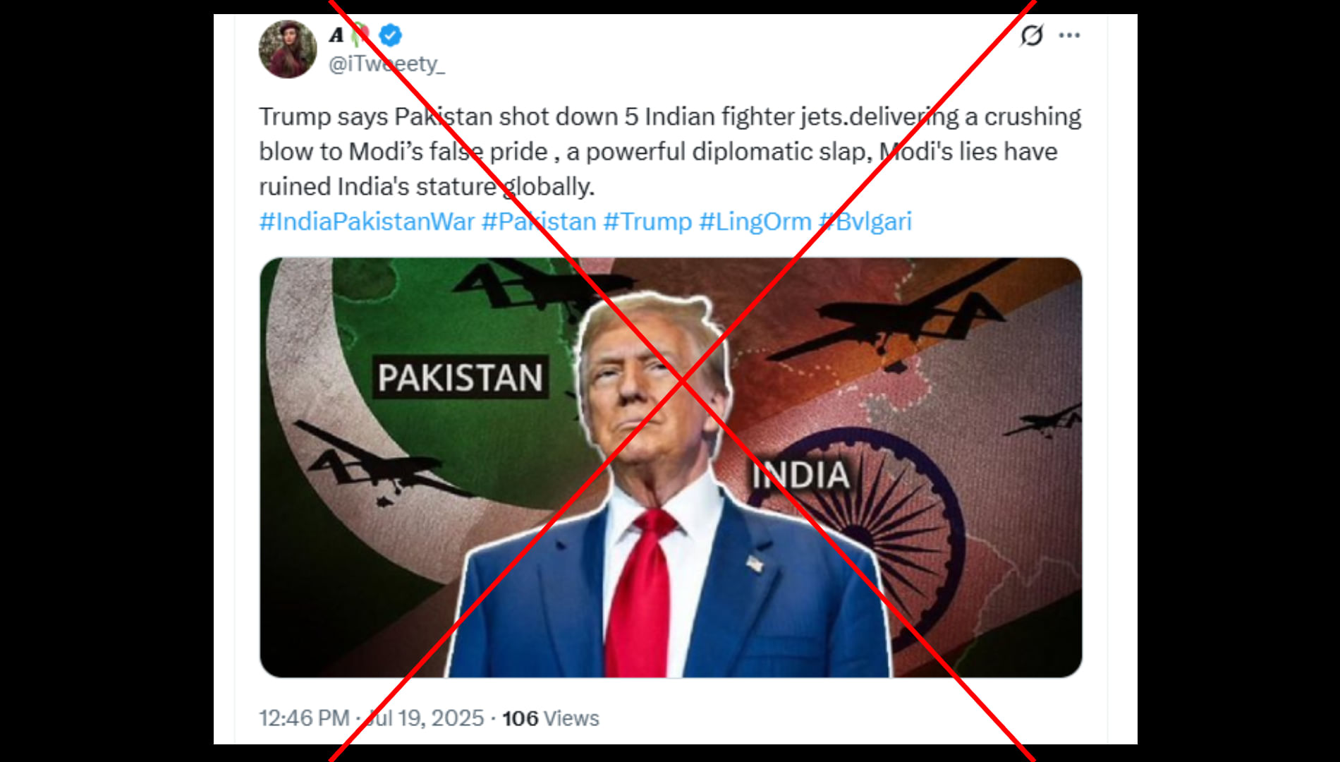 पाकिस्तान एक बार फिर ने भारत के खिलाफ झूठ फैलाने की कोशिश कर रहा है। पाकिस्तानी सोशल मीडिया हैंडल्ड द्वारा एक पोस्ट वायरल की जा रही है। पोस्ट को शेयर कर दावा किया जा रहा है कि अमेरिकी राष्ट्रपति डोनाल्ड ट्रंप ने माना है कि भारत और पाकिस्तान के बीच हुए संघर्ष में पाकिस्तान ने भारत के पांंच लड़ाकू विमानों को मार गिराया था।