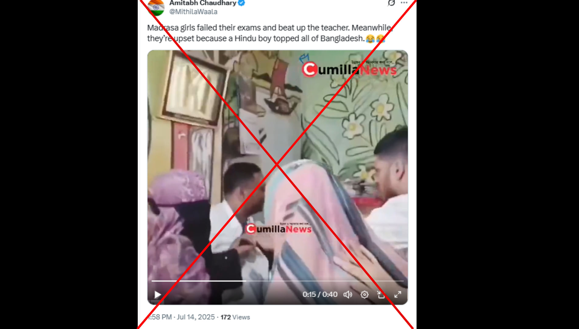 अमिताभ चौधरी (@MithilaWaala) नाम के एक्स यूजर ने लिखा “मदरसे की लड़कियों ने परीक्षा में फेल होने पर शिक्षक की पिटाई कर दी। वे इस बात से नाराज हैं कि एक हिंदू लड़के ने पूरे बांग्लादेश में टॉप किया है।” पोस्ट का लिंक आप यहां और आर्काइव लिंक यहां देख सकते हैं।