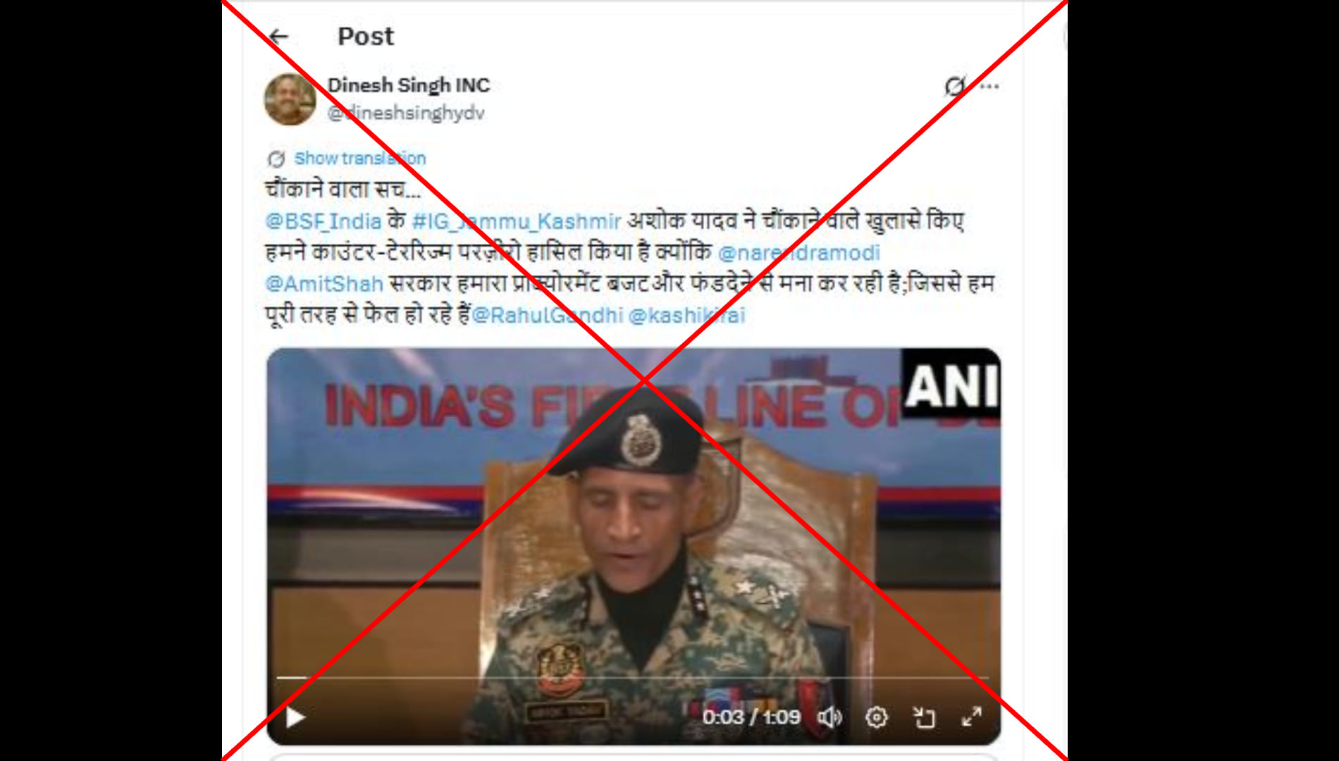 दिनेश कुमार आईएनसी (@dineshsinghydv) नाम के एक्स यूजर ने लिखा, “चौंकाने वाला सच...बीएसएफ जम्मू- कश्मीर के आईजी अशोक यादव ने चौंकाने वाले खुलासे किए हमने काउंटर-टेररिज्म पर जीरो हासिल किया है क्योंकि नरेंद्र मोदी और अमित शाह सरकार हमारा प्रोक्योरमेंट बजट और फंड देने से मना कर रही है; जिससे हम पूरी तरह से फेल हो रहे हैं।“ पोस्ट का लिंक आप यहां और आर्काइव लिंक यहां देख सकते हैं।