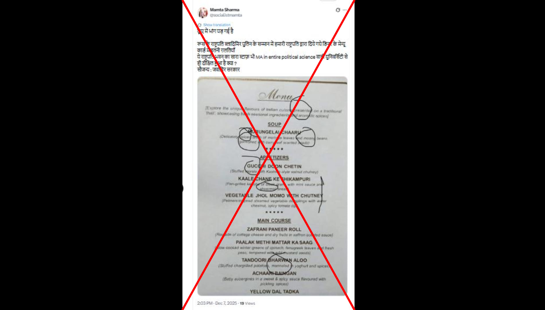ममता शर्मा (@socialistmamta) नाम के एक्स यूजर ने लिखा, “कूंए में भांग पड़ गई है। रूस के राष्ट्रपति ब्लादिमिर पुतिन के सम्मान में हमारी राष्ट्रपति द्वारा दिये गये डिनर के मेन्यू कार्ड में इतनी गलतियां ये राष्ट्रपति भवन का सारा स्टाफ़ भी MA in entire political science वाली युनिवर्सिटी से ही दीक्षित हुआ है क्या? सौजन्य : जवाहिर सरकार।” पोस्ट का लिंक आप यहां और आर्काइव लिंक यहां देख सकते हैं।
