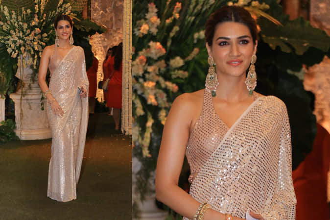 क्रीम और गोल्डन रंग की शीमरी साड़ी और मैचिंग 'trapezium' बैक ब्लाउज में कृति का लुक देखते बनता है। न्यूड मेकअप, कान में हैवी इयररिंग और हाथ में गोल्डन कड़े के साथ कृति ने अपने ट्रेडिशनल लुक को पूरा किया। हेयरस्टाइल की बात करें तो साड़ी के साथ अक्सर सेंटर पार्टेड बन और सफेद गजरा काफी खूबसूरत लगता है और कृति ने भी ठीक वैसे ही स्टाइलिंग की।