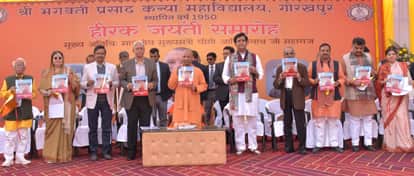 हीरक जयंती समारोह के अवसर पर स्मारिका का विमोचन करते मुख्यमंत्री योगी आदित्यनाथ।