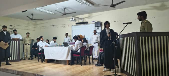 बीए एलएलबी के विद्यार्थियों की ओर से मूट कोर्ट का आयोजन किया गया। आरुषि हत्याकांड केस को लेकर चार्ज फ्रेमिंग, साक्ष्य परीक्षण, गवाहों से जिरह की गई। विद्यार्थियों ने सीआरपीसी, भारतीय साक्ष्य अधिनियम और दंड संहिता की विभिन्न धाराओं का संदर्भ लेते हुए जिस आत्मविश्वास, कानूनी समझ और तर्कबद्धता के साथ अपनी प्रस्तुतियां दीं। साक्ष्य परीक्षण के दौरान घटनास्थल के तथ्यों, फॉरेंसिक रिपोर्ट और परोक्ष साक्ष्यों के महत्व पर भी प्रस्तुति दी। इसमें विद्यार्थियों ने न केवल मामले की तकनीकी पेचीदगियों को समझा बल्कि न्याय प्रक्रिया की संवेदनशीलता, दायित्व और नैतिक पक्ष को भी पूरी गंभीरता से व्यक्त किया।