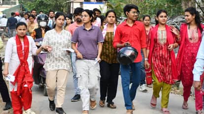 गोरखपुर विश्वविद्यालय के दीक्षा भवन से शोध पात्रता परीक्षा देकर निकलते अभ्यर्थी