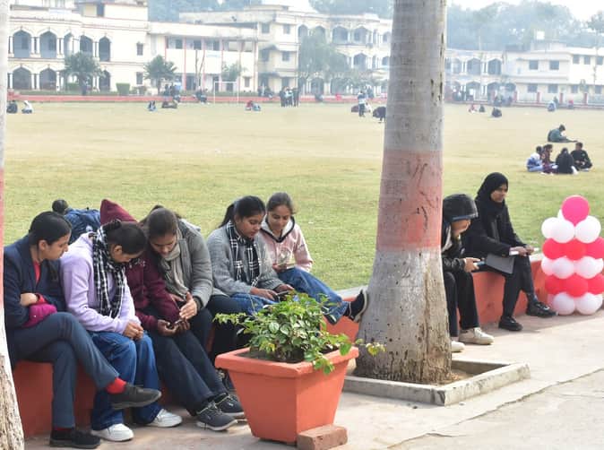 शनिवार को धूप निकलने के बाद कॉलेज के खेल परिसर के पास बैठकर धूप का आनंद लेती यूवतिया।फोटो - संव