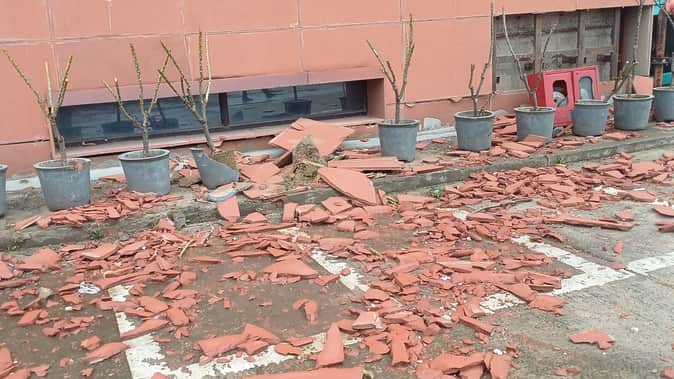 पत्थर गिरने से वहां लगा फायर सेफ्टी होज बॉक्स क्षतिग्रस्त हो गया और पास रखे करीब आधा दर्जन गमले चकनाचूर हो गए। इस घटना के बाद भवन की गुणवत्ता पर सवाल उठने लगे हैं। इस भवन में दीवारों की हालात काफी खराब है। कई जगह से टाइल व सीवरेज के ढक्कन तक गायब हो गए हैं। वहीं सीढि़यों से मार्बल भी टूट चुकी है। इस भवन में 20 से अधिक विभाग के कार्यालय हैं।