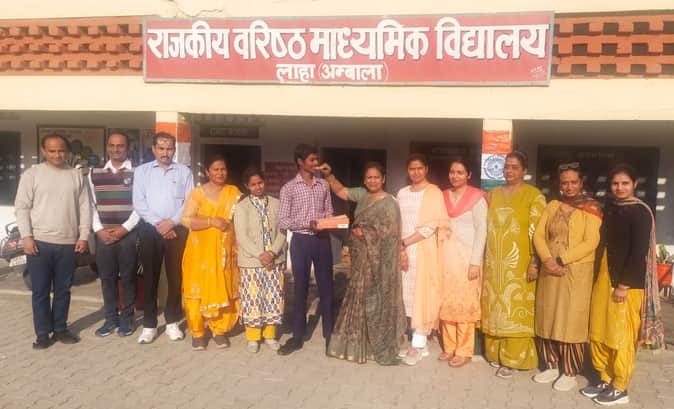 नारायणगढ़ के लाहा स्थित सरकारी स्कूल के छात्र को सम्मानित करतीं प्राचार्य व स्टाफ। प्रवक्ता