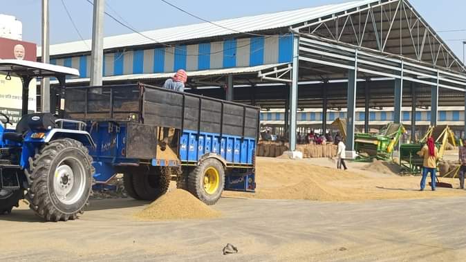शहर के नई अनाज मंडी में धान की ट्राली को खाली करते हुए मजदूर। संवाद