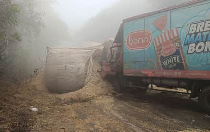 तूड़ा से भरा ट्राॅला पलटा, एंबुलेंस सहित चार वाहन टकराई