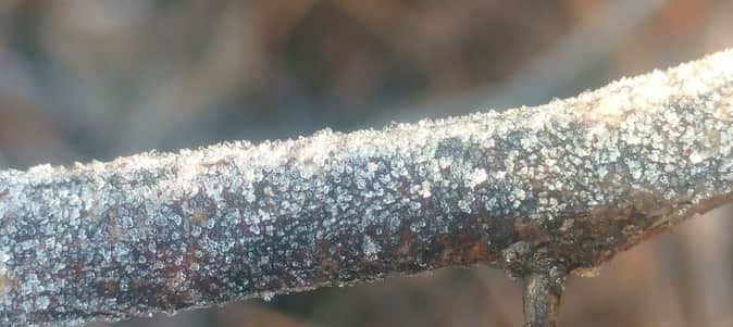 गांव अजीतपुर के खेतों में शुक्रवार को लकड़ी पर जमीं बर्फ।