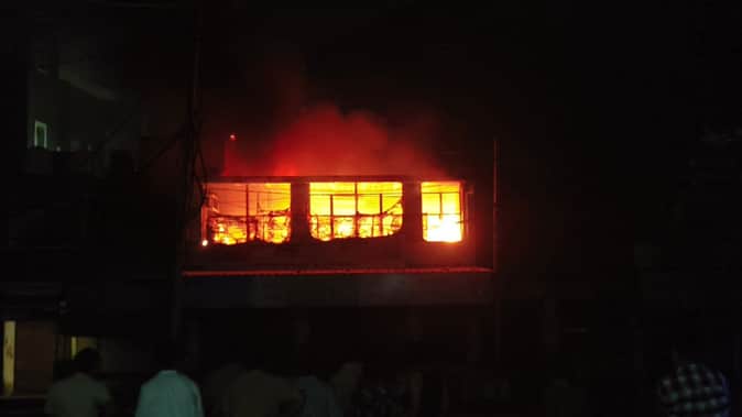 तोशाम में दो मंजिला पंसारी की दुकान में लगी आग।