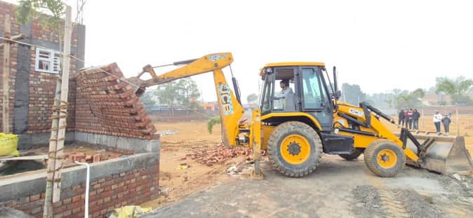 तोशाम रोड टीआईटी ग्राउंड के पास चार एकड़ में अवैध कॉलोनी को तोड़ती जेसीबी