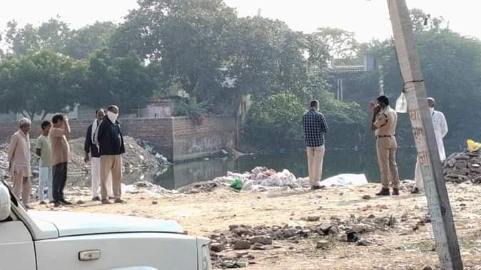 जोहड़ के अंदर शव मिलने की सूचना के बाद मौके पर पहुंची पुलिस।