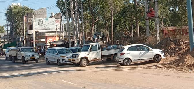 लोहारू में पार्किंग के बाहर सड़क पर खड़े वाहन।