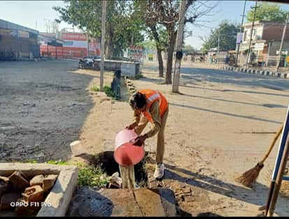 दूषित पानी को नाले में डालता सफाई कर्मचारी।