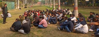 भिवानी में शिक्षा बोर्ड परिसर में द्वार बैठक करते कर्मचारी। स्वयं