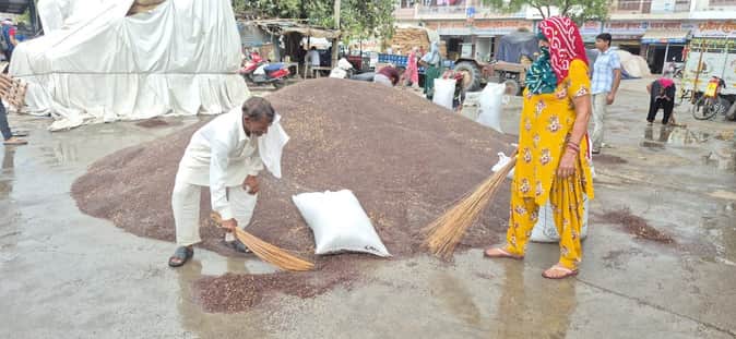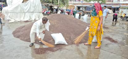 शहर की अनाज मंडी में भीगने के बाद सरसों से पानी निकालते श्रमिक।