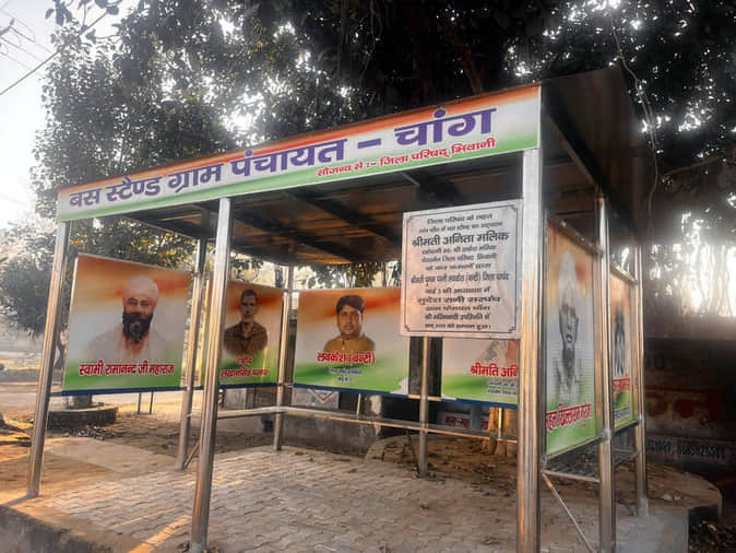 गांव चांग में बना बस क्यू शेल्टर के अंदर लगाई गई प्रसिद्ध हस्तियों के चित्र।