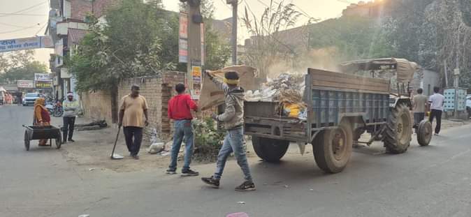 शहर के सर्कुलर रोड पर मैनुअल तरीके से सफाई के बाद ट्रैक्टर ट्राॅली में कूड़ा डालते कर्मचारी।