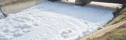 गांव दांग के नजदीक निगाना फीडर में ड्रेन का पानी डालने से नहर में जमा सफेद झाग।