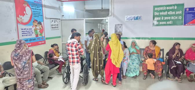 नागरिक अस्पताल में स्थित अल्ट्रासाउंड कक्ष के बाहर बैठे मरीज