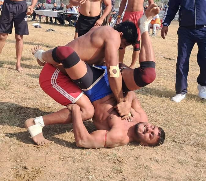 भीम स्टेडियम में आयोजित सांसद खेल महोत्सव के दौरान दमखम दिखाते कबड्डी खिलाड़ी