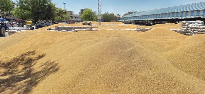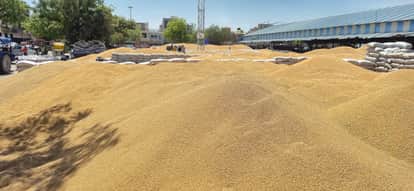 शहर की अनाज मंडी में खुले आसमान के निचे रखा गेहूं।