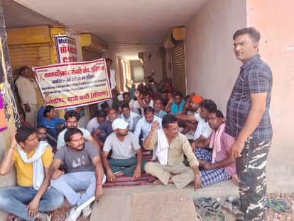 नगर परिषद कार्यालय परिसर में धरने पर बैठे सफाई कर्मचारी।