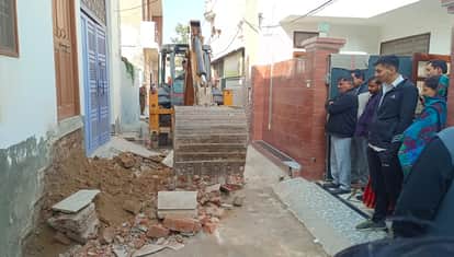 दादरी के कॉलेज रोड के समीप गली में चबूतरे तोड़ती जेसीबी।
