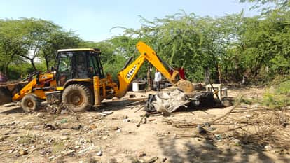 सरकारी जमीन पर बनीं झुग्गियों को हटाती जेसीबी।