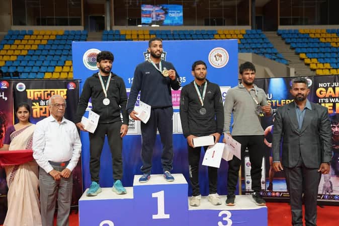 राष्ट्रीय कुश्ती प्रतियोगिता में विजेता पहलवान सुजीत कलकल अपने पदक के साथ।