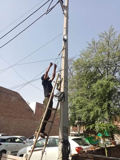 फतेहाबाद में स्ट्रीट लाइटों को ठीक करते हुए कर्मचारी स्त्रोत नगर परिषद