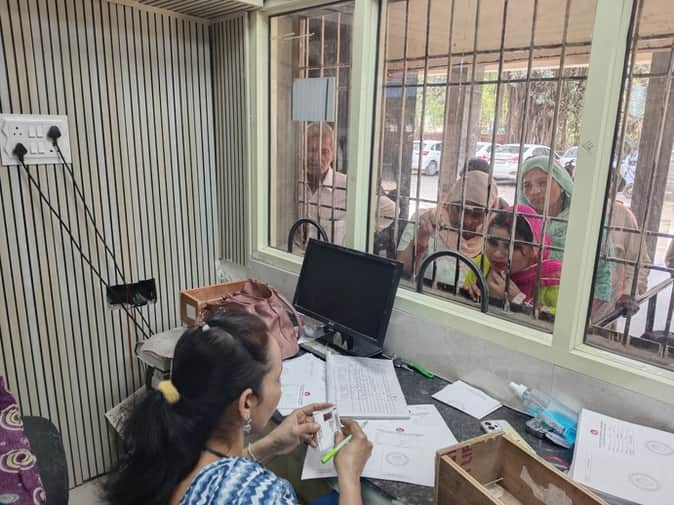 फतेहाबाद के नागरिक अस्पताल में ओपीडी पर्ची कटवाते हुए मरीज ।