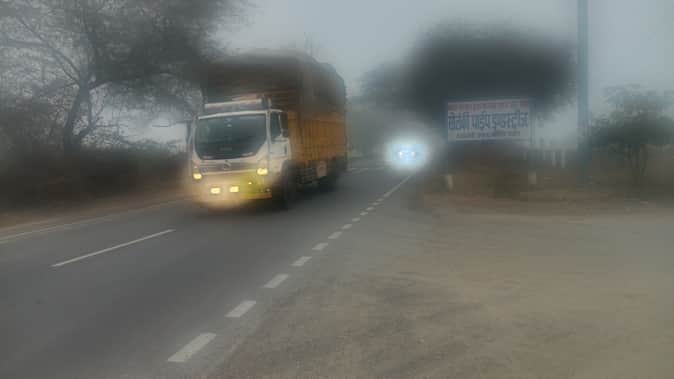 भट्टू से फतेहाबाद रोड पर अलसुबह धुंध के दौरान गुजरते वाहन चालक। संवाद