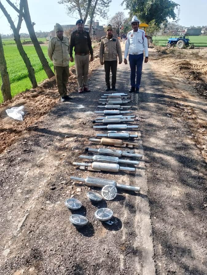 फतेहाबाद जिले में अवैध मोडीफाइड साइलेंसरों को नष्ट करवाते हुए पुलिस अधिकारी। पुलिस विभाग