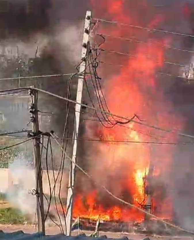 ट्रांसफार्मर से उठतीं आग की लपटें।