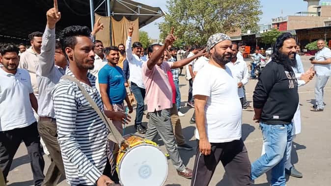 सब्जी मंडी के प्रधान पद के नतीजे घोषित होने के बाद खुशी मनाते आढ़ती। संवाद