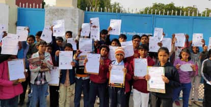 हिसार में परीक्षा केंद्र में एंट्री न देने के बाद अपने एडमिट कार्ड दिखाते परीक्षार्थी।
