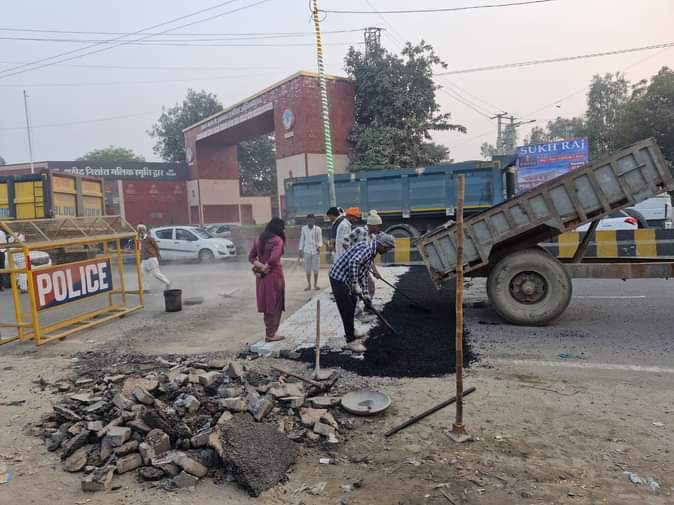 हांसी हिसार चुंगी पर ब्रेकर बनाते कर्मचारी और निरीक्षण करतीं जेई मोनिका। संवाद