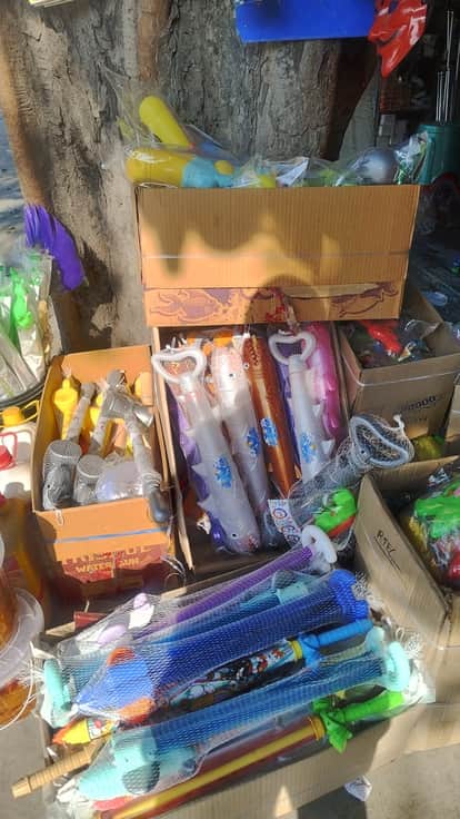 हिसार। बाजार में सबसे अधिक बिक रही हेलीकॉप्टर व मछली पिचकारी।