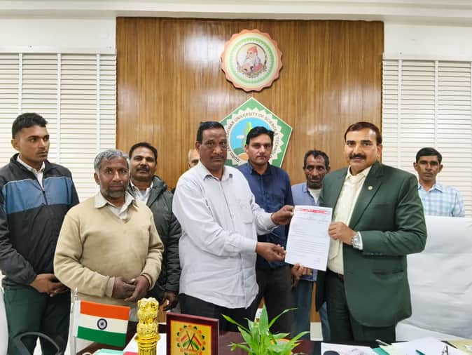 जीजेयू के कुलपति प्रो. नरसीराम बिश्नोई को ज्ञापन सौंपते यूनियन के पदाधिकारी। स्रोत : संगठन