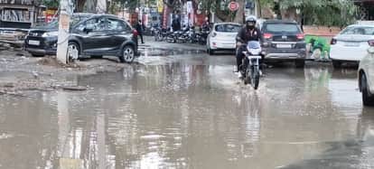 अर्बन स्टेट में बरसात के बाद भरे पानी से गुजरते वाहन चालक।