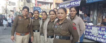 शहर के एक चौक पर महिलाओं व छात्राओं की सुरक्षा में तैनात दुर्गा शक्ति टीम।
