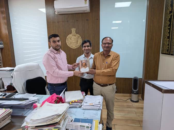 17jjrp19- एसडीएम बहादुरगढ़ को किताब भेंट करते आर्ट ऑफ लिविंग के स्टेट कोऑर्डिनेटर राजवीर सिंह