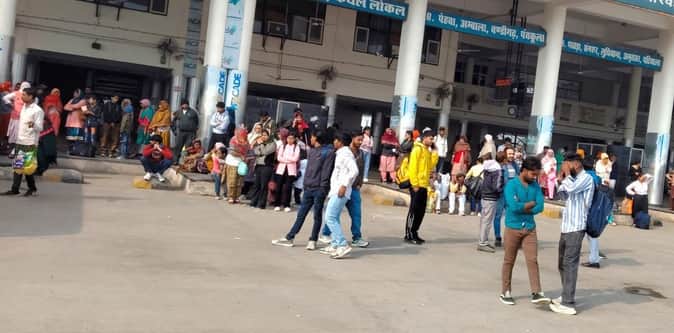 31जेएनडी37-बस अड्डे पर बस आने के इंतजार में खड़े यात्री। संवाद